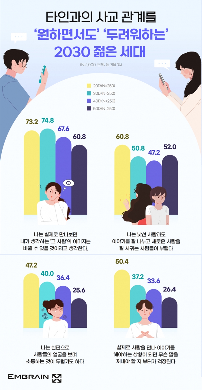 반면 ‘사람들의 얼굴을 보며 소통하는 것이 두렵다’(20대 47.2%, 30대 40.0%, 40대 36.4%, 50대 25.6%)와 ‘실제로 사람을 만나 이야기해야 할 때 무슨 말을 꺼내야 할지 걱정된다’(20대 50.4%, 30대 37.2%, 40대 33.6%, 50대 26.4%)에서 20대 연령층의 대면 소통에 두려움이 크게 나타났다. 20대 2명 중 1명은 대면 소통이 어려운 상황인 셈이다.