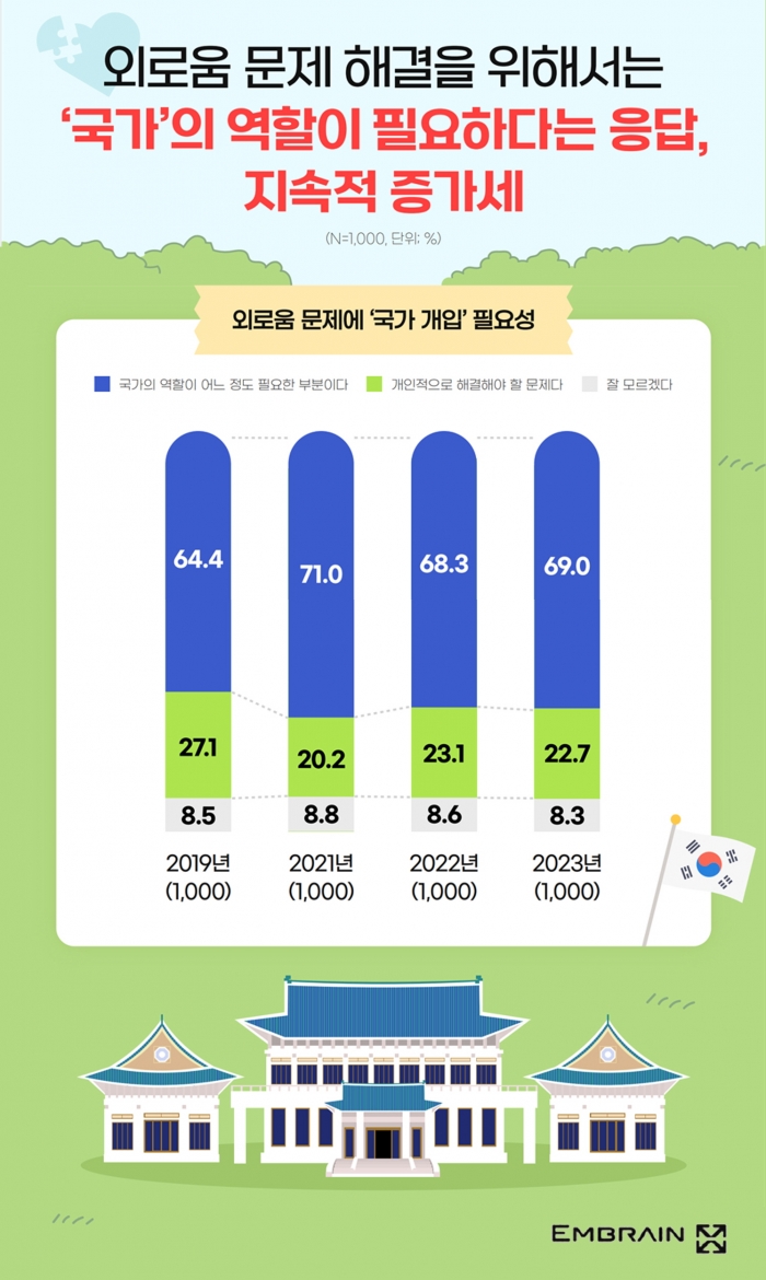 외로움 문제 해결을 위해 국가 역할이 필요하다는 인식은 여전히 높은 수준으로 나타나고 있다. 엔데믹에 접어들어서도 응답 비율은 69%로, 지난 2년 응답률(71%(2021년), 68.3%(2022년))과 큰 차이를 보이지 않았다.