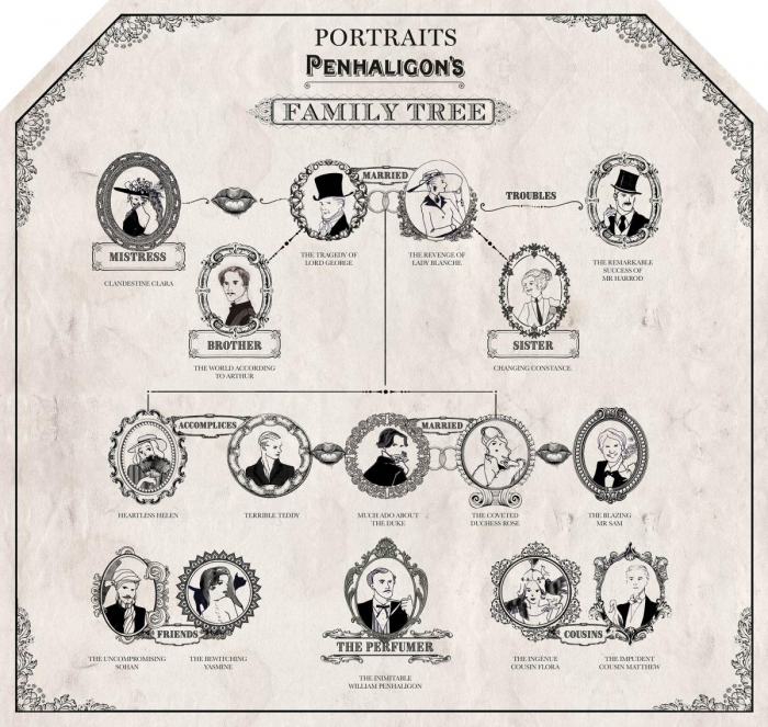 펜할리곤스는 이 가계도에 등장하는 인물들의 캐릭터를 극대화한 다양한 동물 모양 보틀에 그들 각자의 캐릭터를 잘 표현한 향수를 담아 판매한다.