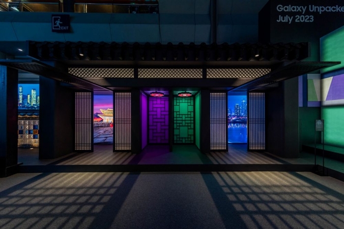 갤럭시Z플립·폴드5 체험존은 한옥을 본뜬 공간으로 꾸며졌다. 기와가 얹어진 담장 벽이 놓이고 창호문으로 부스를 둘렀다. 갤럭시Z플립과 폴드5는 한국의 미와 어우러져 한옥 문살 무늬 벽과 도자기 위에 전시됐다.