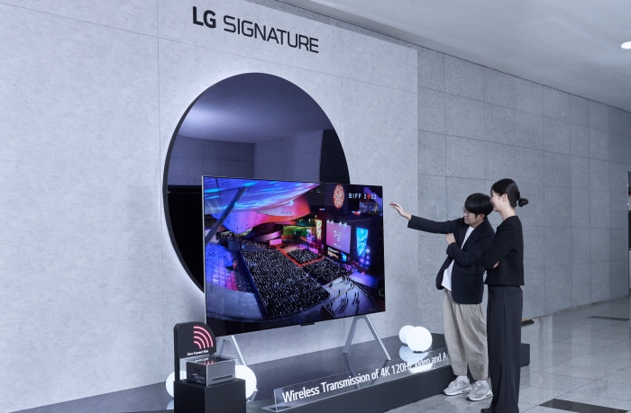 12일 시상식이 개최된 부산 ‘KNN시어터’ 로비에서는 LG전자의 10년 올레드 기술력을 상징하는 LG 시그니처 올레드 M(모델명: 97M3)을 전시해 방문객들의 눈길을 끌었다.