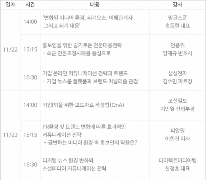 기업PR을 위한 보도자료 작성법, 기업 온라인 커뮤니케이션 전략과 국내 PR트렌드, 소셜미디어의 미래를 살펴볼 예정이다.