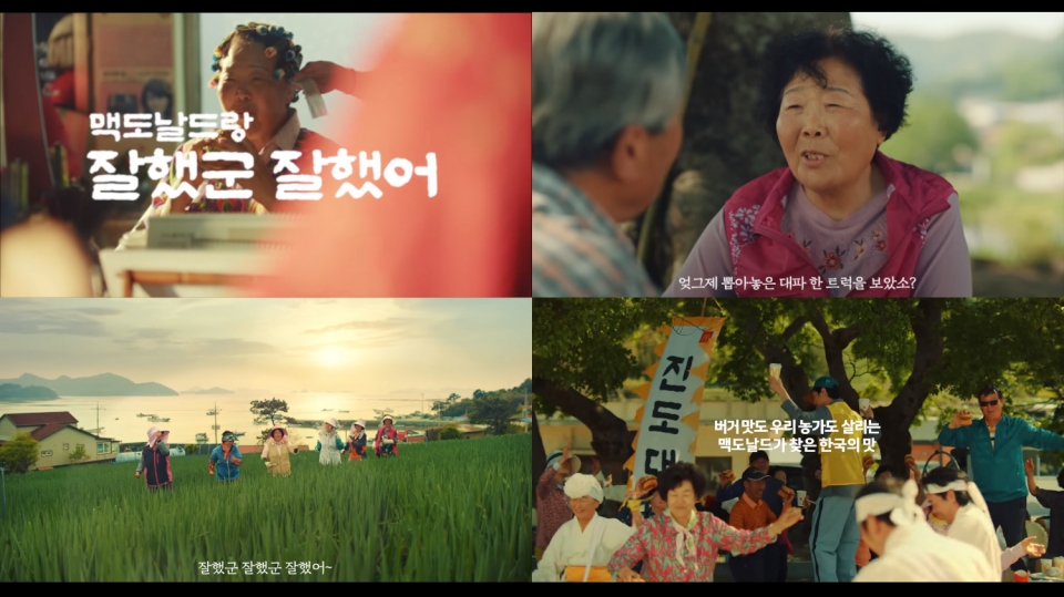 진도 민요를 개사한 '맥도날드랑 잘했군 잘했어'를 어르신들이 직접 불러 푸근하고 정감 있는 캠페인을 연출했다. 진도 대파밭과 마을 모습을 노래와 함께 담아 지역 상생의 노력을 진정성 있게 전달하려는 것으로 풀이된다.