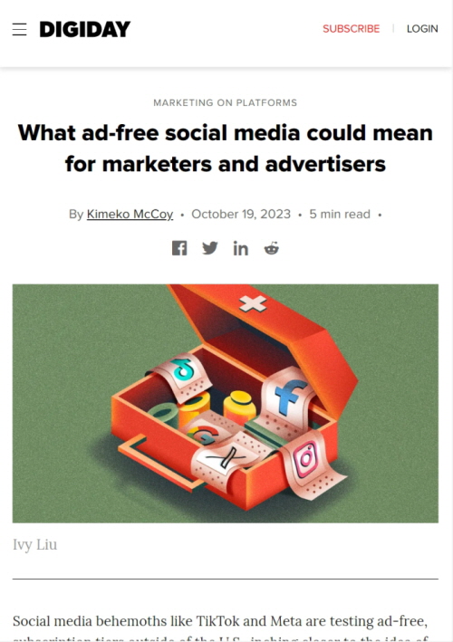 광고 대행사 VMLY&R의 최고 미디어 책임자 젠 콜은 “플랫폼들이 구독 모델을 선호하는 가장 큰 이유는 안정적 수익 구조로 가변적이고 불안정할 수 있는 광고비에 의존하지 않을 수 있다는 점”이라는 분석을 디지데이 인터뷰에서 내놓았다.