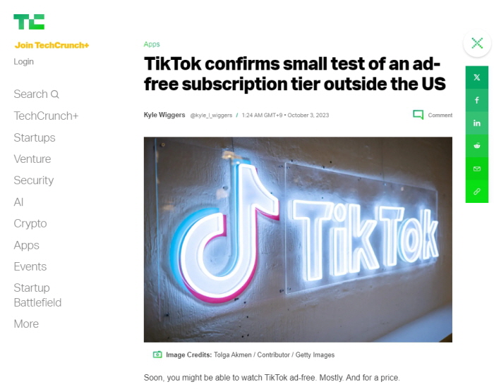 메타의 발표와 비슷한 시기, 틱톡은 미국이 아닌 단일영어권 일부 지역에서 월 4.99달러짜리 광고 없는 유료구독 서비스를 테스트하고 있다고 시인했다.