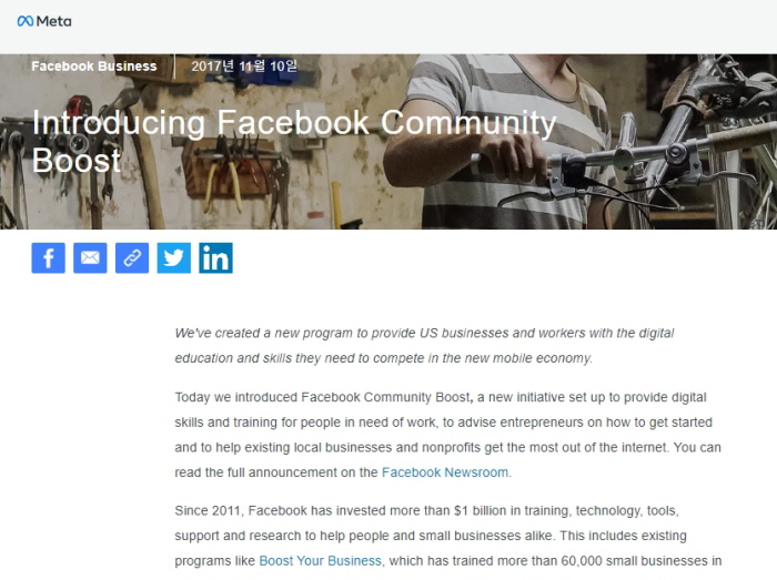 중소기업의 참여와 자금 흐름을 유지하기 위해 메타는 2017년 중소기업의 디지털 기술을 향상시키기 위한 30개 도시 프로그램인 ‘페이스북 커뮤니티 부스트’와 같은 이니셔티브를 시작하기도 했다.