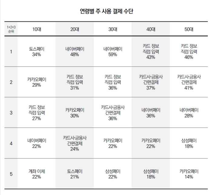 주 사용 결제수단은 연령별로 다소 다르게 나타났는데, 10대에서는 토스페이가 34%로 가장 많아 눈길을 끌었고, 20대와 30대는 네이버페이(48%, 59%), 40대와 50대는 카드 정보 직접 입력(43%, 46%)가 가장 많았다.