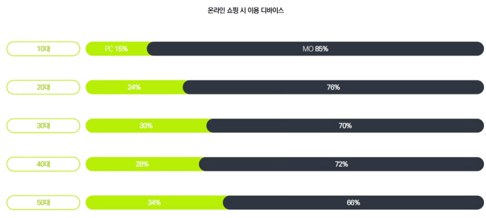 온라인 쇼핑을 할 때 주로 이용하는 디바이스가 모바일이라는 응답이 모든 연령대에서 높게 나타났는데, PC를 이용한다는 응답도 40대 28%, 50대 34%로 나타나 고연령층에서는 여전히 PC를 편하게 느끼는 소비자가 적지 않았다.