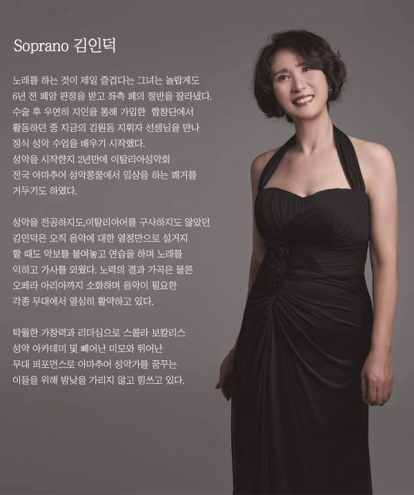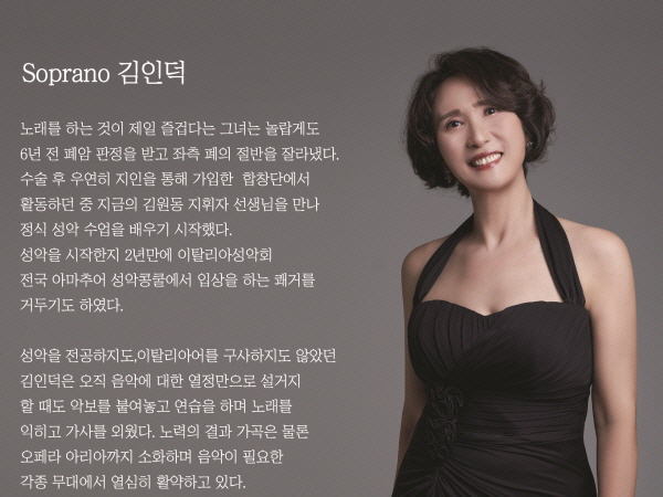 더피알=김경탁 기자 | 폐암을 이겨낸 아마추어 소프라노 김인덕의 독창회 ‘Love Concerto’가 11월 4일 오후 7시 30분 서울 서초구의 모차르트홀에서 열린다.