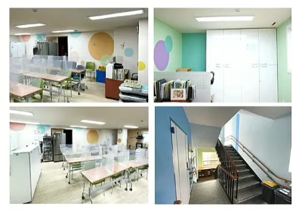 칙칙했던 공간은 알록달록하게 변했다. 강당과 체력단련실은 주황·연두 계열의 강조색으로 밝고 활동적인 분위기를 내고, 휴게실은 노란 계열의 난색으로 칠해 심리적 안정감을 줬다. 미끄러지기 쉬운 계단에는 도드라지는 색상의 미끄럼 방지 테이프를 시공해 안전사고를 예방했다.