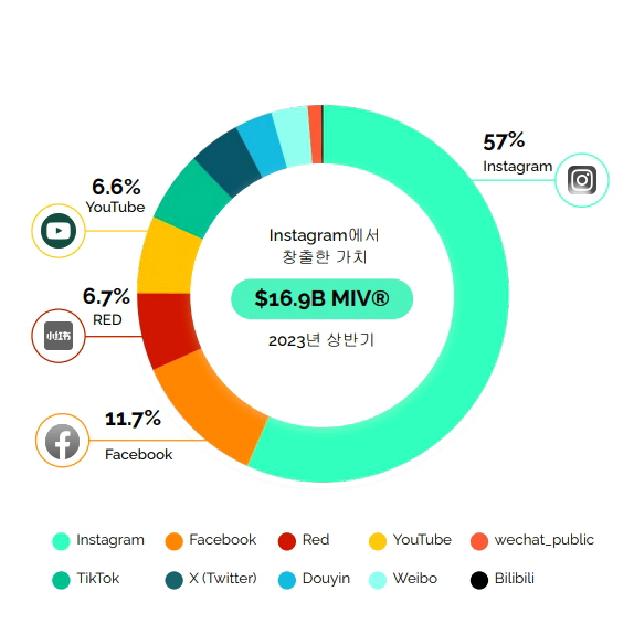 런치메트릭스 리포트에 따르면 인스타그램은 2023년 상반기 총 169억달러(약 22조3354억원)에 이르는 미디어 영향력 가치(MIV)를 창출한 것으로 나타났다. 이는 전체 소셜 브랜드의 MIV 중 57.7%를 점하는 수치다.