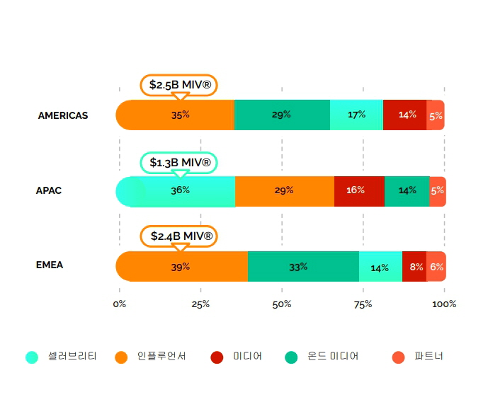 반면 미 대륙과 유럽·중동·아프리카 지역에서 가장 영향력이 큰 발신자는 인플루언서였다. 두 지역 모두 인플루언서가 각각 35%, 39%의 MIV 지분을 차지하며 1위에 올랐고, 그 뒤를 온드 미디어-셀러브리티-미디어가 순서대로 이었다.