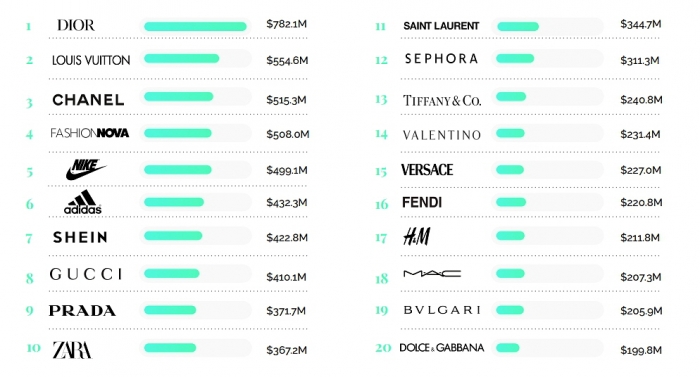 브랜드 부문에서, 세계적으로 인스타그램에서 가장 강력한 MIV를 기록한 브랜드는 디올(DIOR)이었다. 디올의 MIV는 7억8210만달러(약 1조316억원)에 달했다. 2위는 5억5460만달러(약 7315억원)를 기록한 루이비통, 3위는 샤넬(5억1530만달러, 약 6797억원)이었다.