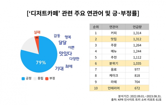 빅데이터를 통해 디저트 관련 연관어를 살펴보면, ‘맛집’과 ‘분위기’, ‘인테리어’가 상위 연관어로 도출되었다. 이는 디저트가 하나의 식문화로 자리 잡음과 동시에 매장 분위기와 인테리어 등이 디저트 선정에 주요 요인이 될 수 있음을 시사한다.