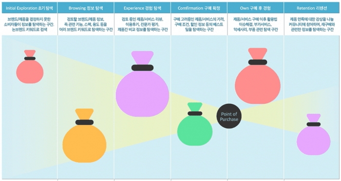 구매 여정은 총 6단계로 구분된다. 아직 브랜드를 결정하기 전 단계인 초기 탐색, 브랜드에 관한 정보를 찾는 정보 탐색, 브랜드를 비교하는 경험 탐색, 브랜드를 구매하는 구매 확정, 이후 경험에 대한 구매 이유, 마지막으로 재구매 등이다.