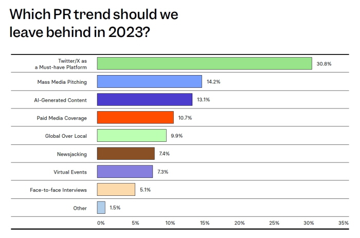 이밖에 올해 아웃될 트렌드 리스트에는 ‘필수 플랫폼으로서의 X(트위터)’(31%, 1위)와 ‘매스미디어 피칭’(무차별 무작위 보도자료 배포. 14.2%, 2위), 유료 기사 보도(기사형 광고, 10.7%, 4위), 로컬보다 글로벌 우선(9.9%), 뉴스재킹(7.4%), 버츄얼 이벤트(7.3%), 대면 인터뷰(5.1%) 등이 꼽혔다.