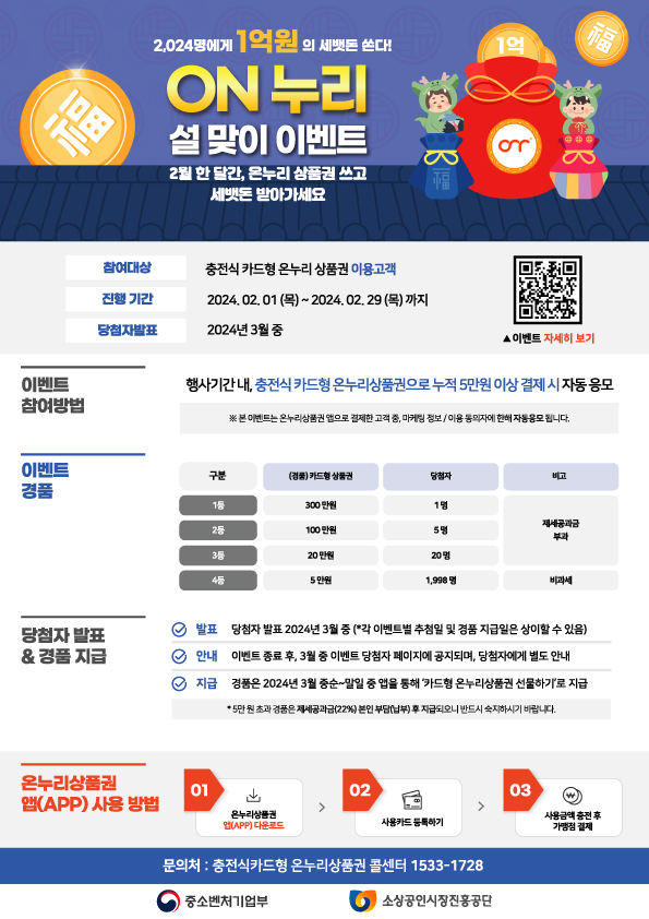 한편 중소벤처기업부와 소상공인진흥공단은 충전식 카드형 온누리 상품권 이용고객들을 대상으로 2월 한달간 설맞이 이벤트를 진행중이다. 카드형 온누리상품권으로 2월 1일부터 29일까지 사이에 누적 5만원 이상 결제하면 자동으로 응모되는 이 이벤트는 1등 상금 300만원을 비롯해 총 상금 1억원을 2024명에게 나눠주는 행사로, 당첨자는 3월중에 발표된다.