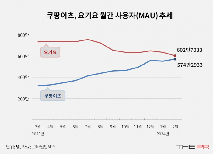 모바일 앱 분석 기업 아이지에이웍스(IGAWorks)의 모바일인덱스에 따르면 쿠팡이츠의 월간 사용자 수(MAU)는 지난해 3월 319만명대에서 올 2월 574만명대로 증가했다.