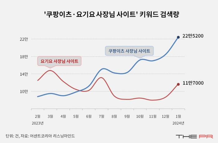 점주들 사이에서도 관심의 정도가 다르게 나타났다. 검색 데이터 기반 마케팅 테크기업 어센트코리아의 리스닝마인드 데이터에 따르면 ‘쿠팡이츠 사장님 사이트’의 검색량이 지난해 2월 8만7700회에서 올 1월 22만5200회로 급증했다.