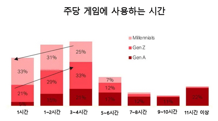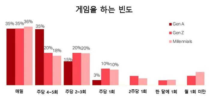 보고서에 따르면 특히 알파세대에서는 70%가 일주일에 최소 4~5회 게임을 즐기며 전 세대 중 가장 열렬한 모습을 보였다. 이들에게 게임은 단순히 플레이를 위한 콘텐츠가 아닌 새로운 소셜미디어 채널로도 작용했다.