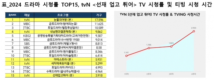 더피알=김민지 기자 | “요즘은 TV 안 본다” 혹은 “OTT가 있는데 굳이 본방사수할 필요가 있냐”는 말이 무색할 정도로 2024년 들어 tvN 시청률에 나타난 상승세는 눈이 부실 정도다.