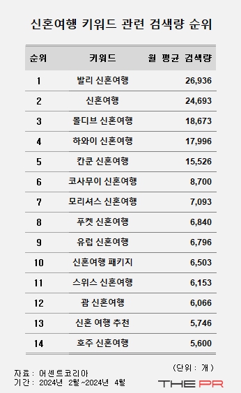 신혼여행지로 가장 많이 검색되는 여행지는 ‘발리’, ‘몰디브’, ‘하와이’, ‘칸쿤’, ‘코사무이’ 순이었다. 이 경우 여행지를 선택하게 되는 기준은 ‘1000만원’ 이내의 저렴한 여행지인지, 어떠한 종류의 ‘패키지’ 상품이 있는지 등이 두드러졌다.
