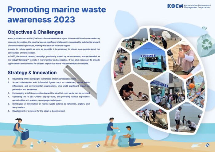 수상자 소개에 따르면 해양환경공단은 해양쓰레기 심각성에 대한 국민 인식 제고와 생활 속 해양쓰레기 줄이기 동참 독려를 위해 리브랜딩한 해안정화 캠페인 ‘알줍! 캠페인’을 6개월간 전국 24개 해수욕장에서 진행한 결과 2061명의 시민이 2746kg의 해양 쓰레기를 수거했다.