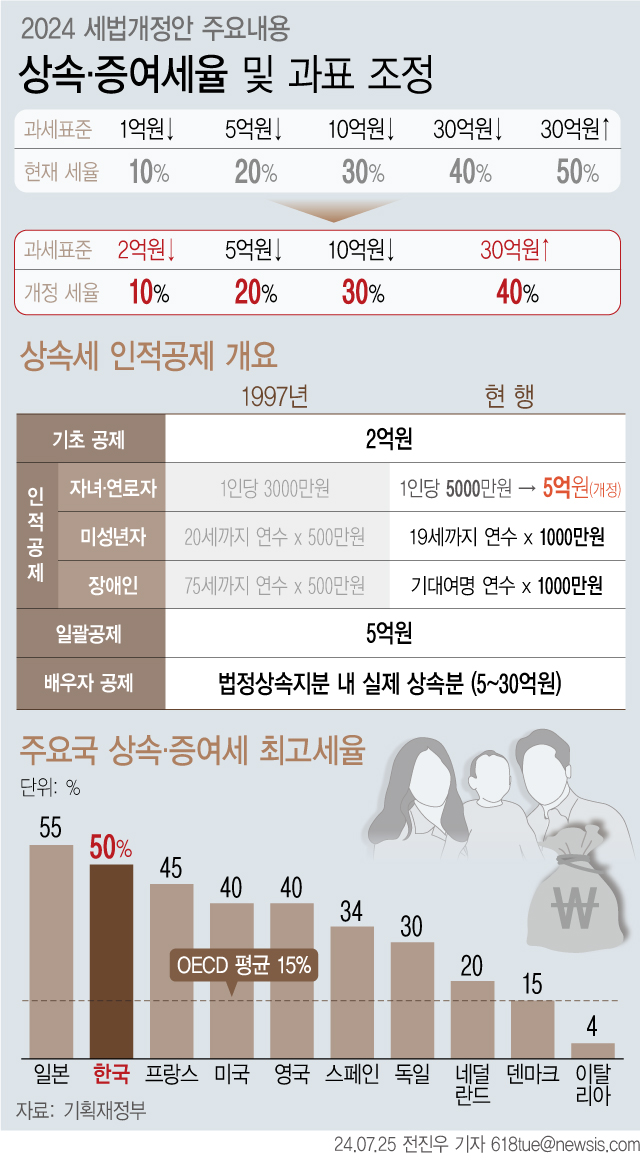 실제로 현행 우리나라의 상속세 최고세율은 일본(55%)에 이어 OECD 회원국 중 두 번째로 높다. 이번 개정을 통해 최고세율이 40%로 낮아지면, 우리나라의 상속세 최고세율은 미국·영국과 같은 수준이 된다.