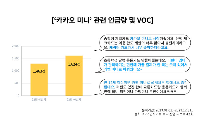 관련 VOC 분석에서도 자녀를 위해 카카오뱅크 미니 카드를 발급하는 부모 세대 소비자가 많아진 것을 확인할 수 있다. 실물 카드 발급에서 나아가 애플리케이션을 통한 금융 활동 관리가 편리한 점이 주요 요인으로 분석된다.