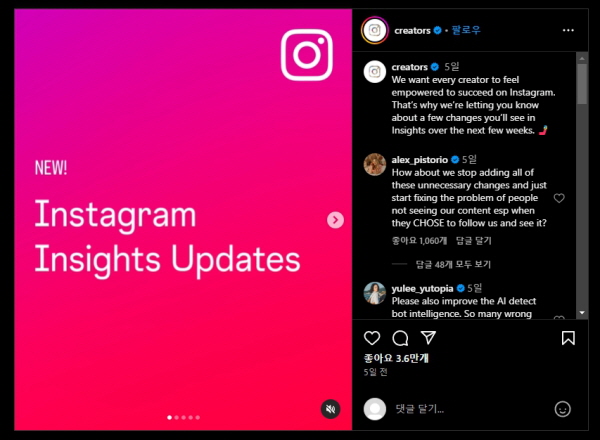 인스타그램은 지난 7일 크리에이터스 커뮤니티 계정을 통해 인사이트 업데이트를 공지했다.