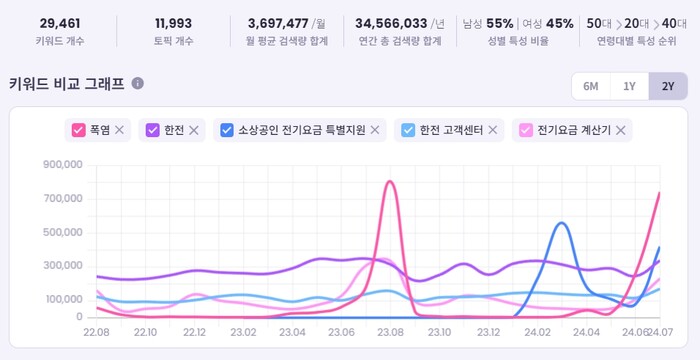 어센트코리아의 검색 빅데이터 분석 솔루션 ‘리스닝마인드 허블’ 데이터와 센서타워 자료를 비교해서 보면, ‘폭염’ 키워드의 상승이 ‘전기요금’과 ‘한전ON(혹은 한전온)’ 키워드에 대한 관심과 연동돼있다는 것을 유추할 수 있지만 그래프의 상승 정도가 다르기 때문이다.