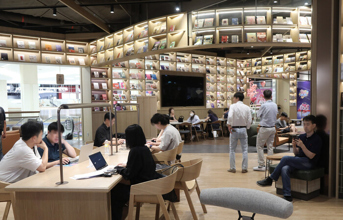 기존 이마트였다면 물건들로 가득차 있었을 스타필드 마켓 죽전 1층은 스타필드의 ‘별마당도서관’을 연상케 하는 거대 휴식 공간으로 변했다. 150평 규모의 ‘북그라운드’ 라운지와 개방감 있는 스타벅스와 영풍문고 매장, 이벤트 존까지, 이들이 통일감 있게 연결되며 약 700평의 공간이 온전히 고객 휴식 공간을 위해 쓰였다.