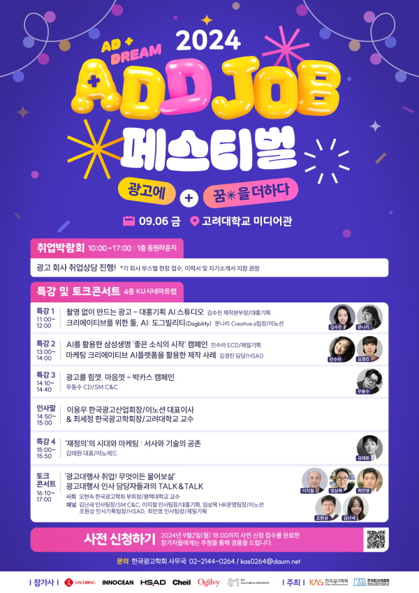 올해 3회째를 맞는 ‘2024 ADD JOB 페스티벌’은한국광고산업협회와 한국광고학회가 주관하는 대규모 취업박람회로, 이노션, 제일기획, HSAD, 대홍기획, 오길비, SM C&C 등 국내 주요 광고회사들이 참여해 인턴십과 취업 관련 정보를 제공한다.