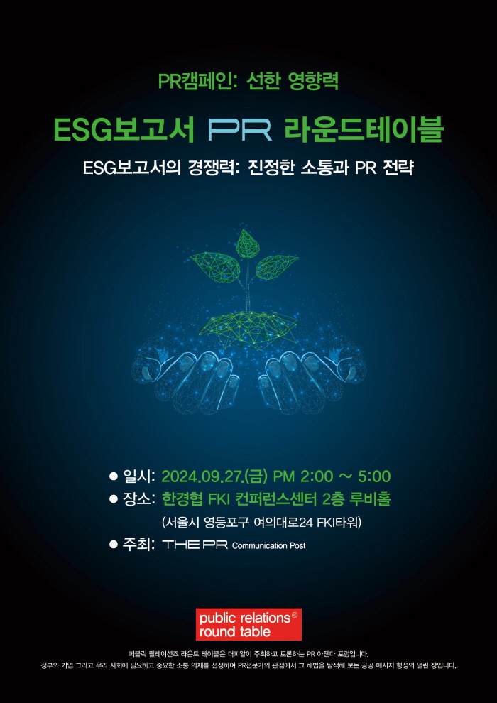 이번 ‘ESG보고서 PR 라운드테이블’은 올해 2월부터 진행중인 ‘더피알 연중기획 PR 캠페인 :선한 영항력’의 일환이다. ‘ESG보고서의 경쟁력: 진정한 소통과 PR 전략’이라는 부제 아래 열리는 이날 행사는 오후 2시부터 유튜브로 생중계도 된다.
