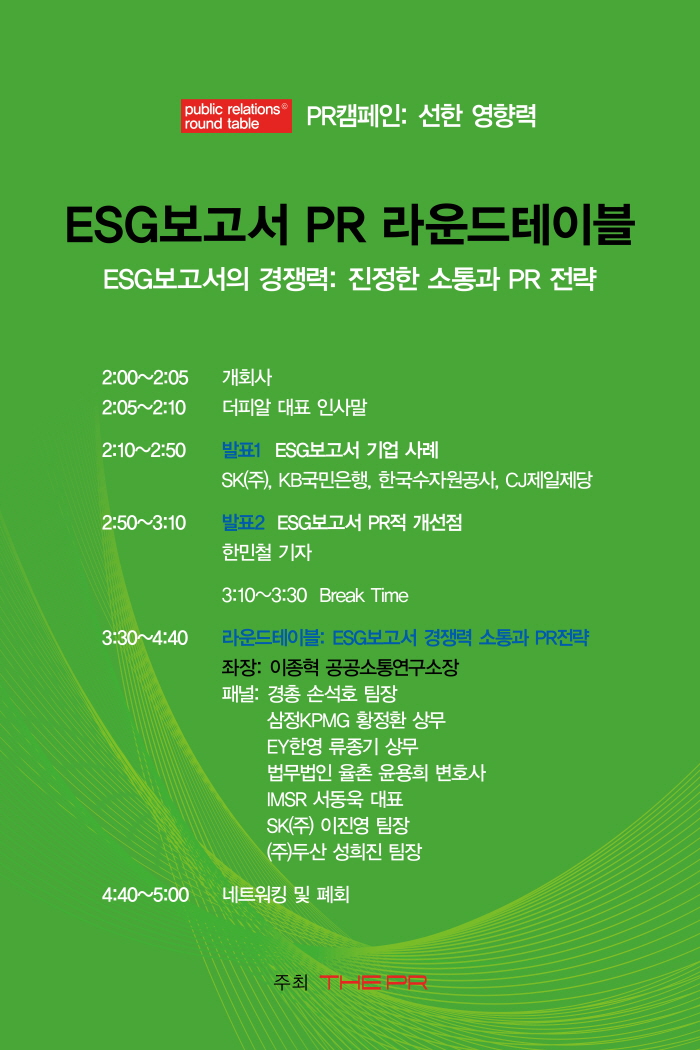 이번 라운드테이블은 ‘더피알 연중기획 PR 캠페인: 선한 영향력’의 일환으로, ‘ESG보고서의 경쟁력: 진정한 소통과 PR 전략’을 주제로 진행된다. 기업의 ESG경영을 투명하게 보여주는 보고서의 진정한 의미와 가치를 탐구하는 자리로, 오후 2시부터 유튜브로 생중계될 예정이다.