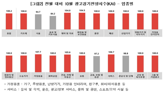 업종별 광고경기전망지수(KAI)에서는 환절기와 성수기를 맞아 가정용품(107.7), 서비스(106.7), 건설·건재 및 부동산(105.6), 화장품 및 보건용품(104.5)에서 광고 집행이 증가할 것으로 예상됐다.특히,