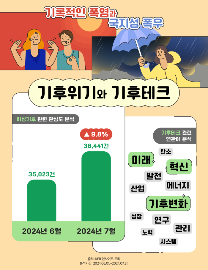 ‘이상기후’ 관련 언급량은 2024년 6월 대비 2024년 7월에 약 10% 상승해 지구촌 날씨에 경각심을 가지고 있음을 확인할 수 있었다.