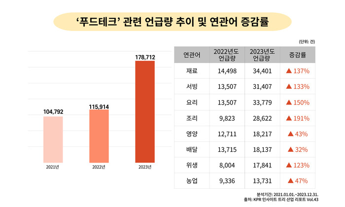 KPR 인사이트 트리의 빅데이터 분석 결과, 푸드테크 관련 언급량 추이를 살펴보면 2021년에는 10만4792건, 2022년 11만 5914건, 2023년에는 17만 8712건으로 해마다 관심도가 증가하는 것을 확인할 수 있다.