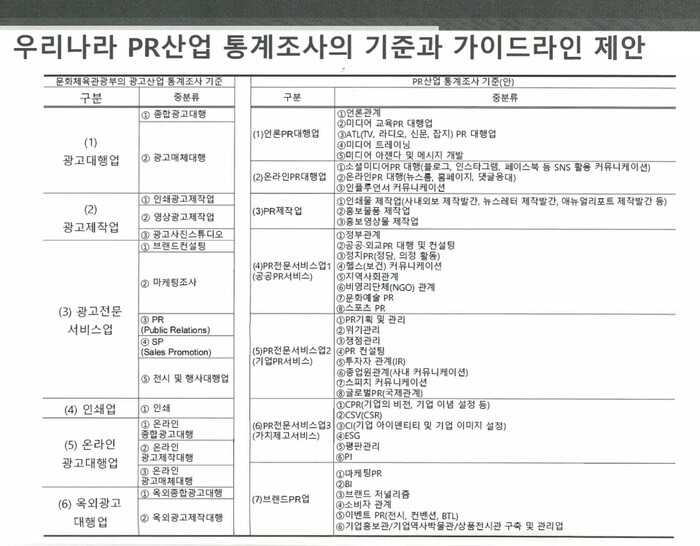 제시된 기준(안)은 문체부의 광고산업 통계조사 기준에 준해 △언론PR대행업 △온라인PR대행업 △PR제작업 △PR전문서비스업1(공공PR서비스) △PR전문서비스업2 (기업 PR 서비스) △PR전문서비스업3(가치제고서비스) △브랜드PR업 등 7개 영역으로 대분류하고 각 영역별로 총 39개 세분류 항목을 배치했다.