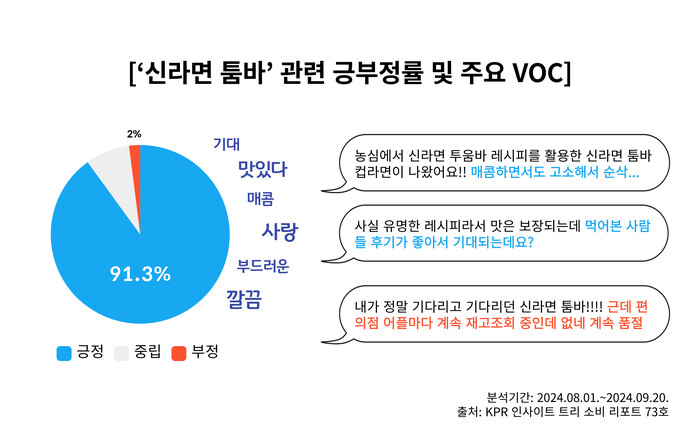 레시피의 제품화에 대한 소비자의 반응도 긍정적인 것으로 나타났다. KPR 인사이트 트리에서 빅데이터를 통해 신라면 툼바에 대한 반응을 조사한 결과, 긍정적인 반응이 90% 이상을 기록했다. 나아가 제품에 대한 주요 감성어 키워드로 ‘맛있다’, ‘기대’, ‘품절’ 등이 나타나, 제품에 대한 소비자의 반응이 긍정적임을 알 수 있다.