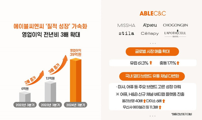 더피알=김영순 기자| 글로벌 뷰티 기업 에이블씨엔씨(대표 신유정)가 국내외 시장에서 고른 성과를 내며 2024년 3분기 질적 성장을 이뤄냈다. 영업이익은 전년 대비 3배 증가한 39억 원을 기록하며 11분기 연속 흑자를 이어갔다. 해외 시장 확대와 국내 신제품 출시 등으로 실적 개선에 박차를 가하고 있다.
