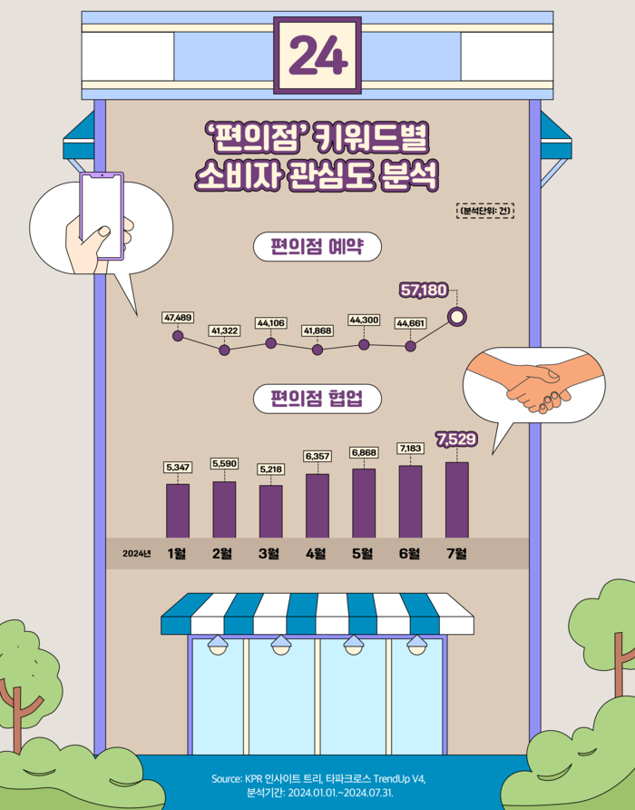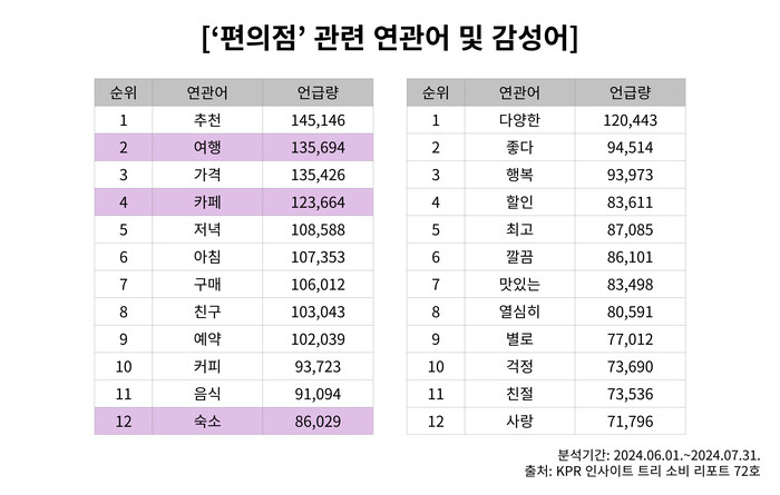 KPR 인사이트 트리의 빅데이터 분석으로 편의점의 방문 목적과 반응을 파악했다. 편의점에 관한 주요 연관어로 ‘여행’, ‘카페’, ‘숙소’ 등 키워드가 나타나, 여름휴가를 준비할 때 편의점의 유무와 거리 등이 중요한 고려 요인으로 작용하는 것을 알 수 있다.