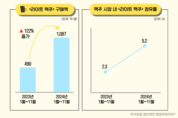 마크로밀 엠브레인의 구매빅데이터® 맥주 트렌드 분석에 따르면, 올해 1월 1일부터 11월 30일까지 대형마트와 편의점에서 판매된 라이트 맥주의 구매 추정액은 1087억 원으로, 전년 동기 대비 무려 122% 증가했다.