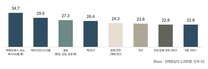 코바코 조사 결과, 2025년 소비자들이 더 많이 소비할 것으로 예상되는 분야는 여행(34.7%), 제약/건강기능식품(29.6%), 금융 서비스(증권, 보험, 은행 등, 27.3%), 책/도서(26.4%) 등의 순이었다.