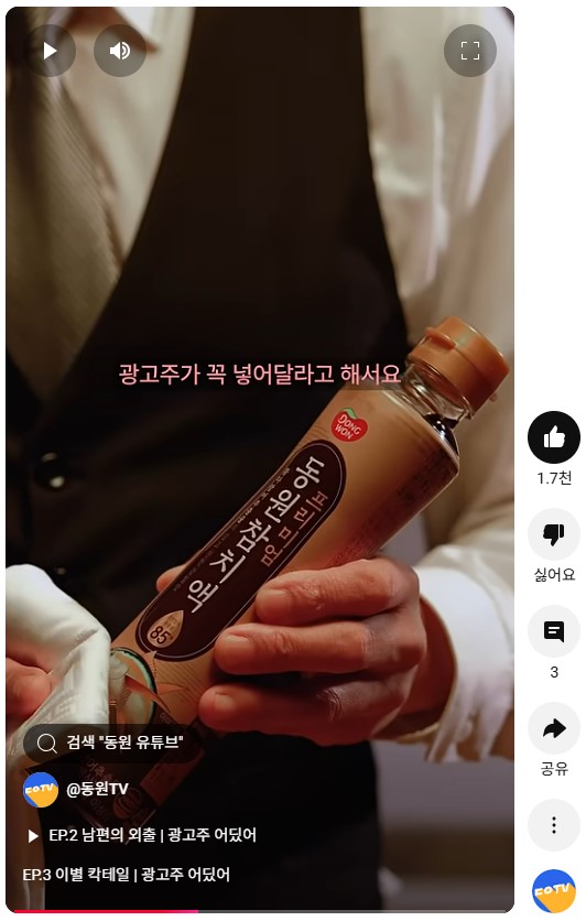 한편 동원TV채널이 ‘광고주 어딨어’의 뒤를 잇는 숏츠 콘텐츠로 내놓은 시리즈의 제목은 ‘동원된 남자’로, 지난 10일 첫 번째 에피소드가 업로드됐다. 한 남성이 나와서 제품 광고를 만드는 과정을 보여주는 내용이다.