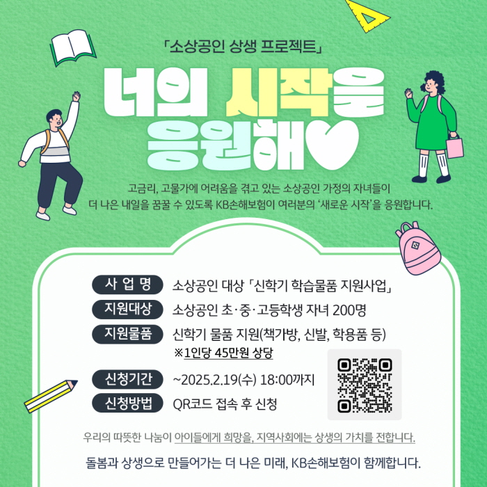 KB손해보험과 국제구호개발 NGO 세이브더칠드런이 함께 진행하는 이 사업은 중위소득 80% 이하 가정의 소상공인 자녀를 대상으로 하며, 선정된 가정에는 △책가방 △신발 △학용품 세트 등 신학기 준비에 필요한 물품이 제공된다.