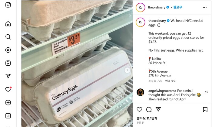 디오디너리는 3월 22~23일경 인스타그램에 계란 사진과 함께 “뉴욕시에 계란이 필요하다고 들었어. 이번 주말 뉴욕 매장에서 일반 가격(ordinarily priced)의 계란 12개를 3.37달러에 구매할 수 있음. 장식이 달리지 않은 그냥 계란이고, 재고가 있는 동안만 판매함”이라는 게시물을 올렸다.