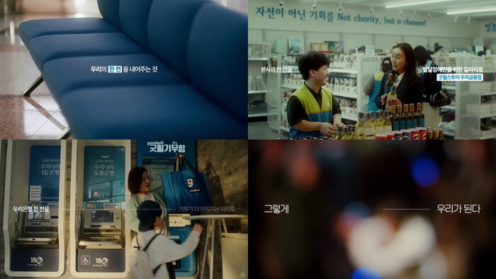 본사의 한 켠은 발달장애인을 위한 일자리 공간으로, 은행의 한 켠은 기부가 쉬워지는 키오스크로, 모모콘서트 좌석의 한켠은 처음 음악을 듣는 아이들을 위한 자리로 바뀐다. 단순한 후원이나 협찬을 넘어 공간을 공유하고 환원함으로써 브랜드의 진심을 실천적으로 전달한 사례다. 광고는 “그렇게 우리가 됩니다”라는 내레이션으로 마무리된다.