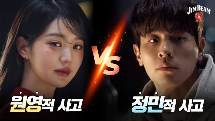 짐빔의 새 광고는 ‘원영적 사고’와 ‘정민적 사고’라는 밈 대결을 중심에 놓는다. 광고 속 박정민은 친구도 집도 여유도 여자친구도 없는 절망적인 현실을 읊는다. 심지어 낭만도 버르장머리도 부모도 (여행 가서) 없는 현실에 장원영마저 “어이없어” 하는 상황이 연출된다.