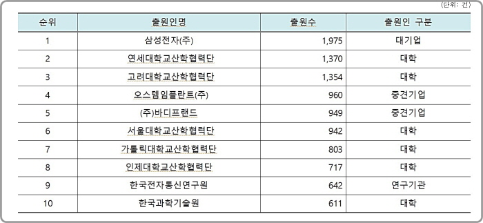 다수 출원인 분석에선 삼성전자가 1975건으로 가장 많았고, 연세대학교(1370건), 고려대학교(1354건), 오스템임플란트가 뒤따랐다.